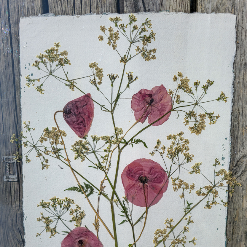 Planterne, jeg bruger i mine værker, er håndplukkede i naturen eller min egen have og presses i minimum tre måneder. Hvert papir testes, hvert tryk justeres, og hvert værk skylles, tørres og vurderes nøje. Det er ikke en hurtig proces. Det er et håndværk.
